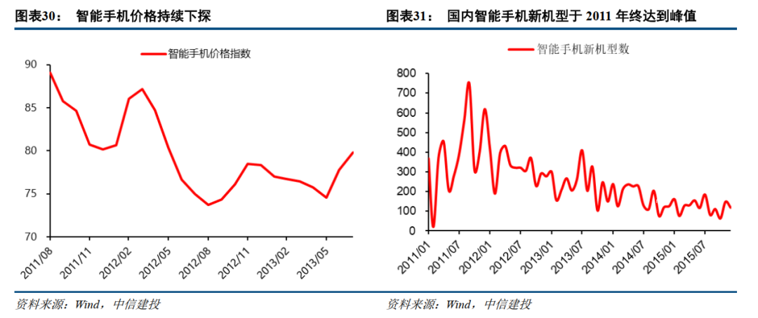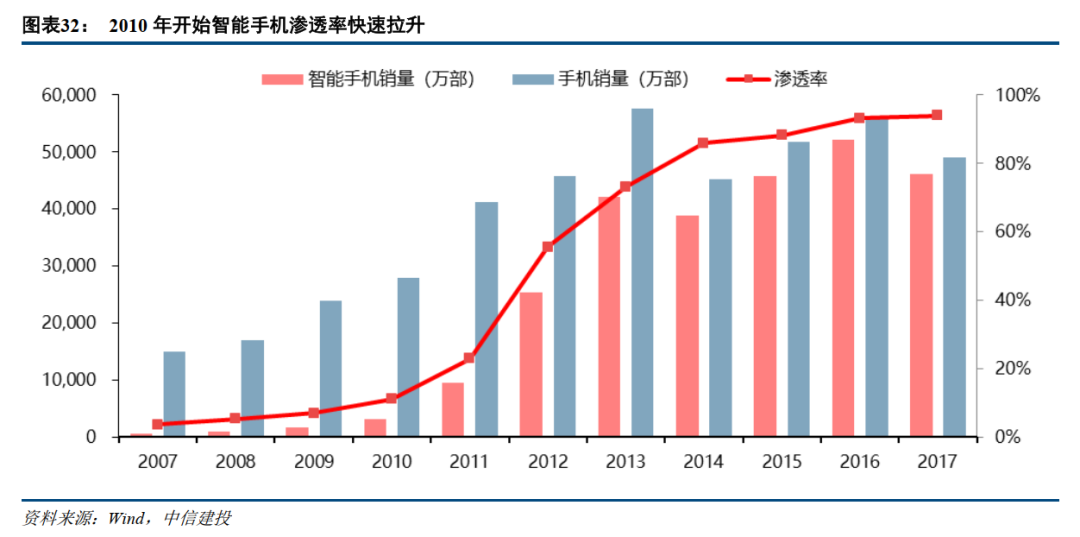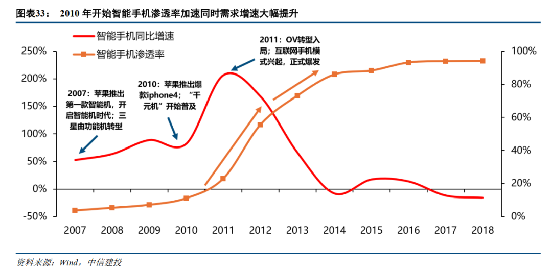3、智能手机则是在2008-2011年,受益于安卓系统的开源、核心芯片方案的成熟以及3G网络的普及,国产手机品牌快速崛起,推动了智能手机产品不断丰富,成本进一步下降。从而带来了渗透率及需求的加速增长。
