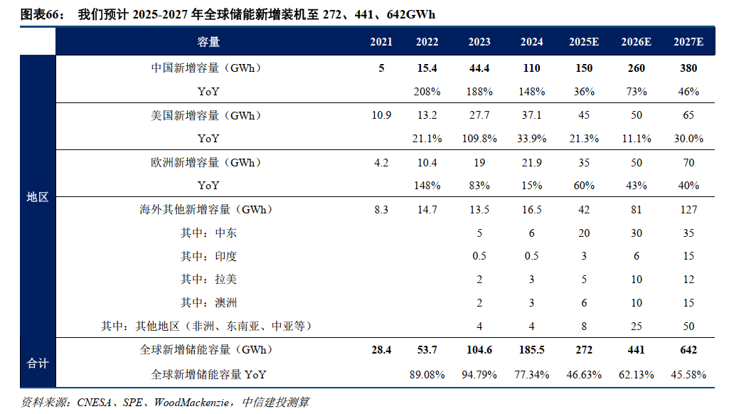 这一背景下,储能渗透率将快速提升。我们预计2025-2027年全球新增储能装机将达到272、441、642GWh。