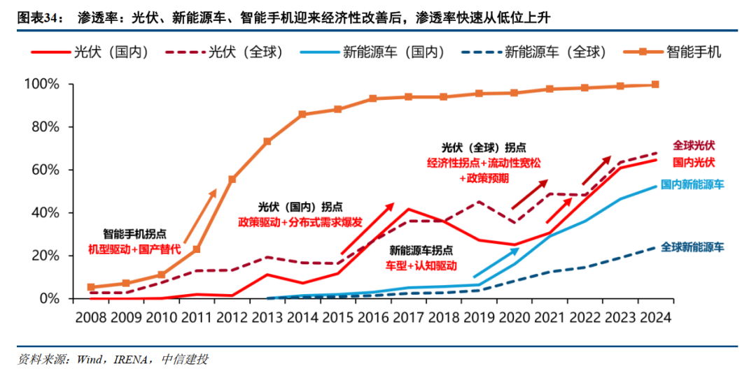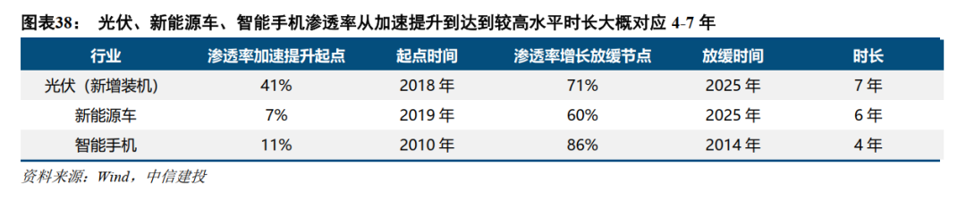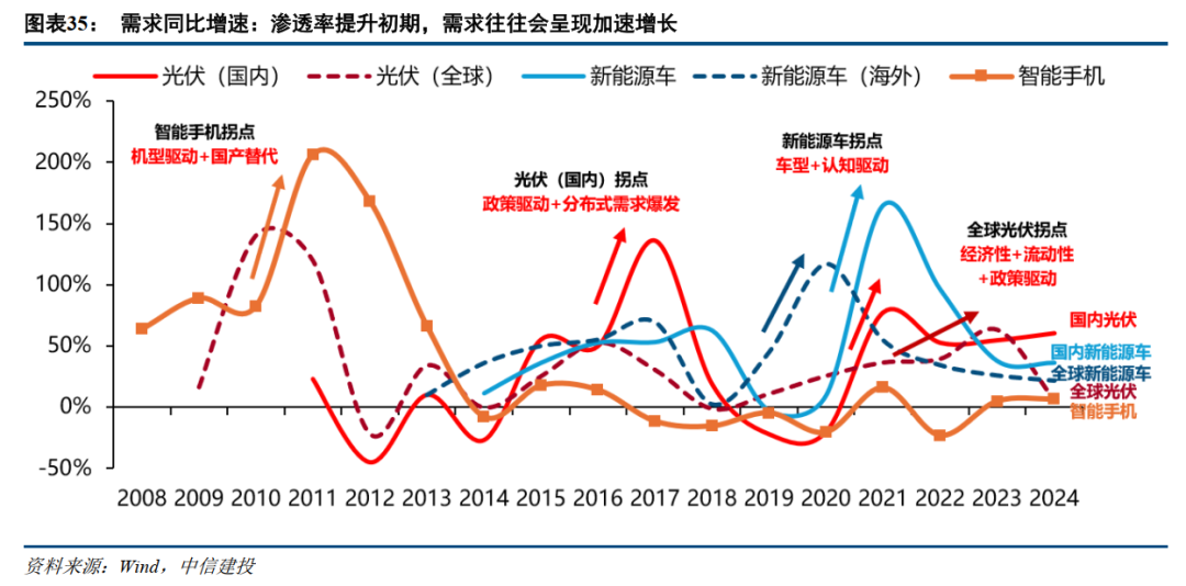 我们将需求爆发前一年作为第0年,后续5年作为1-5年,呈现每个行业的渗透率与需求同比增速。从上述三大行业的历史复盘来看,经济性以及产品力大幅改善是低渗透率行业的需求非线性增长的关键催化。