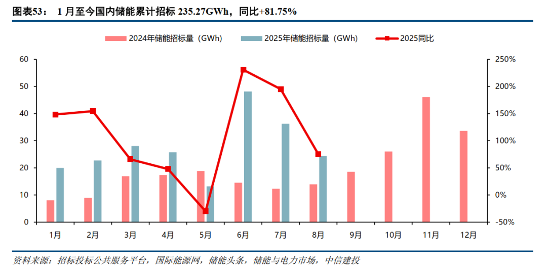 国内储能经济性拐点已然出现,目前状态与光伏、新能源车2020年的特征类似,我们判断行业渗透率即将进入快速提升通道,需求有望自2026年起显著加速。近期招中标数据从需求也可以印证这一判断。国内储能招标规模持续放量,尤其是下半年以来储能项目招标显著增多,1-8月新增中标合计达218.5GWh,同比增长97%,行业高景气度得到验证。