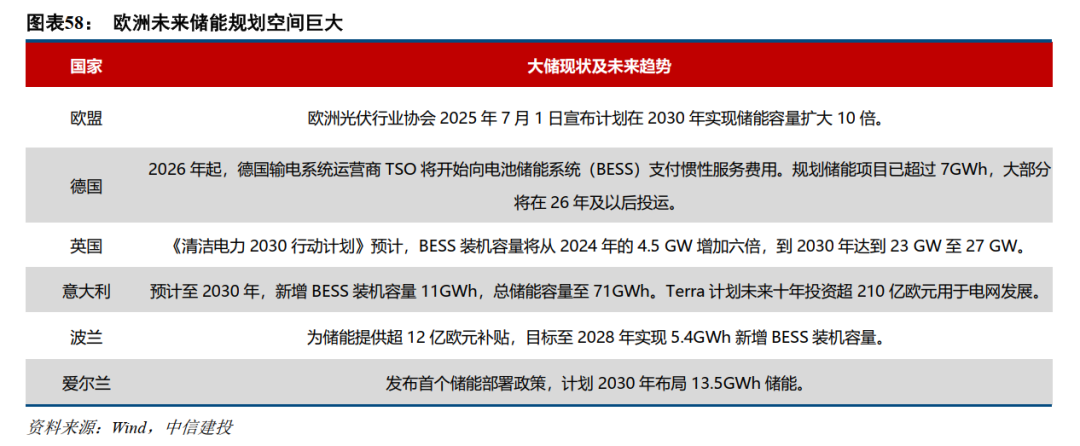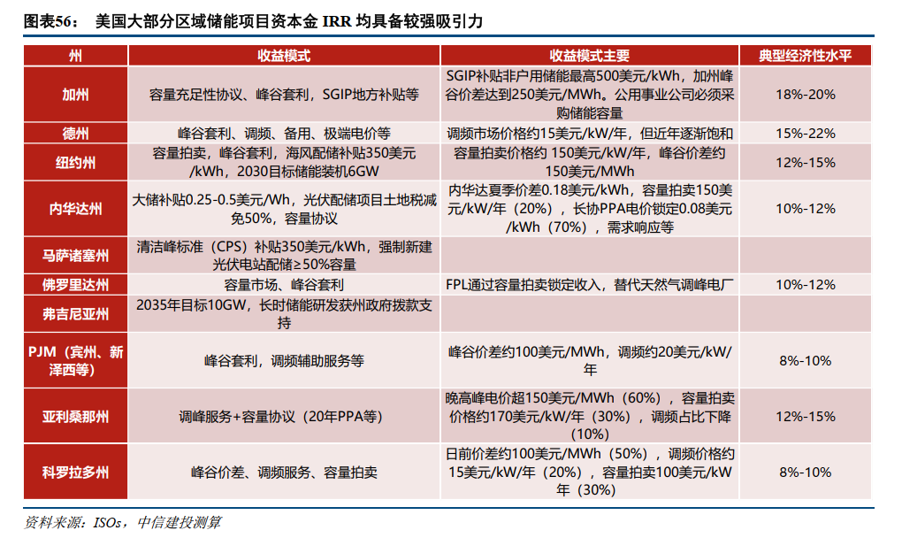 美国市场:大部分区域储能经济性已经较为突出,尤其是中西部地区通过容量购买协议和PPA供电协议能够锁定收益,据我们测算美国目前大部分区域储能项目资本金回报率都能够达到10%以上。而从政策端来看,《大而美法案》要求2026年1月1日后开工的项目受到PFE限制,但今年开工项目规模预计较大,明年并网量预计影响有限。