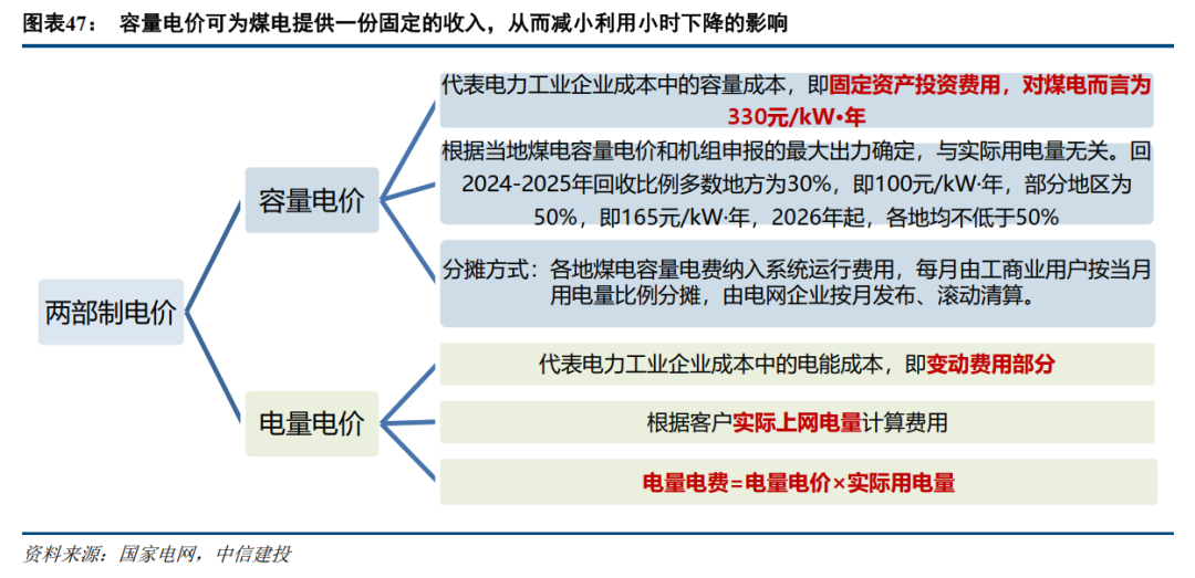 为解决新能源发电渗透率逐年升高后煤电利用小时下降,从而收入下降的问题。2023年11月10日,国家发改委、国家能源局印发《关于建立煤电容量电价的通知》(发改价格〔2023〕1501号),正式提出建立煤电容量电价机制,将现行煤电单一制电价调整为两部制电价,其中电量电价通过市场化方式形成,灵敏反映电力市场供需、燃料成本变化等情况;容量电价水平根据转型进度等实际情况合理确定并逐步调整,充分体现煤电对电力系统的支撑调节价值,确保煤电行业持续健康运行。
