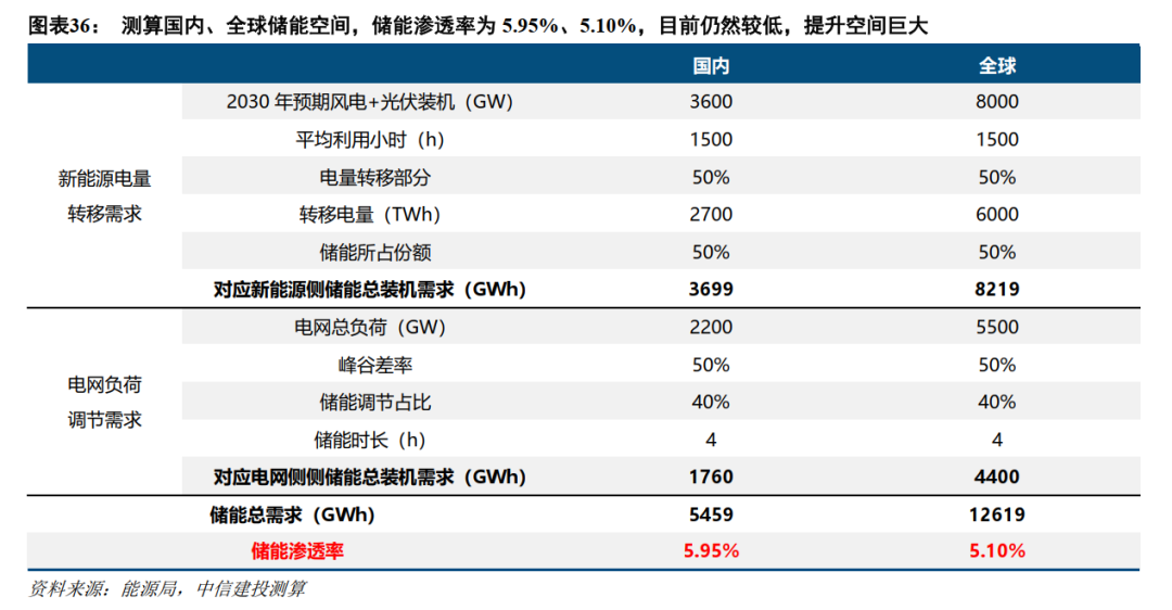 当前储能渗透率仍然较低,未来提升空间巨大。我们以新能源转移需求、电网负荷调节需求拆分储能总装机需求,测算得到国内、全球储能总需求分别在5459GWh、12619GWh,当前储能渗透率仅为5.95%、5.10%,未来提升空间巨大。