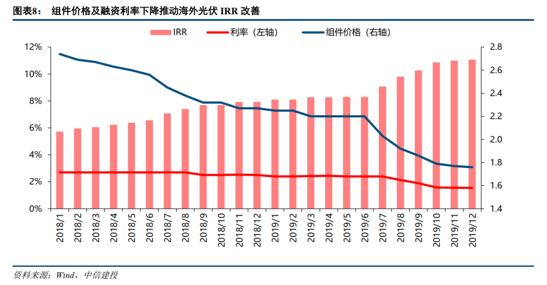 组件降价及融资利率下降推动海外项目经济性显著改善。国内政策调整带来的组件价格持续下行,为海外光伏市场增长提供了核心驱动力。组件价格的持续降低,直接推动了海外光伏电站项目的内部收益率IRR稳步攀升至10%以上,投资回报吸引力大幅增强。