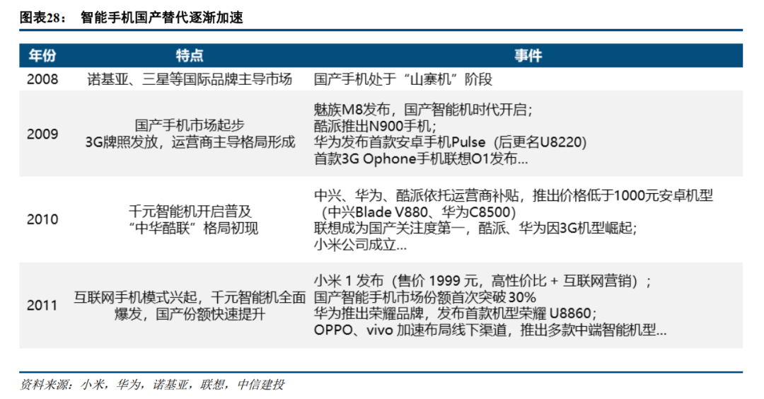千元机市场爆发。2008至2011年间,安卓系统的开源、核心芯片方案的成熟以及3G网络的普及,共同推动了国产手机供给端的快速成熟,大幅降低了行业准入门槛。在此背景下,以“中华酷联”为代表的传统厂商与以小米为代表的互联网新模式厂商共同发力,推动国产手机市场份额在2011年首次突破30%,国产替代进程显著加速。