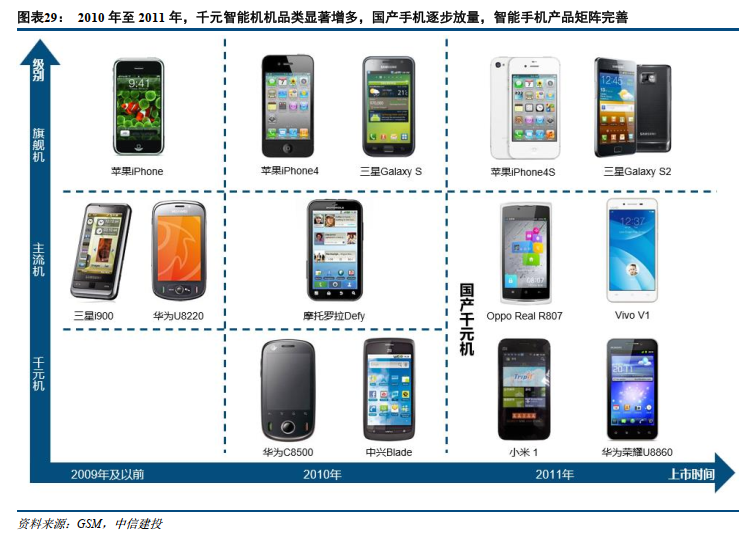 国产品牌崛起奠定供给基础。自2010年起,以华为、中兴为代表的厂商率先推出“千元智能机”。至2011年,小米携高性价比机型入场,OPPO、vivo等品牌也加速布局,千元智能机市场全面爆发。这一供给端的繁荣为不同消费层级提供了多元化的产品选择,推动后续智能手机渗透率快速提升。