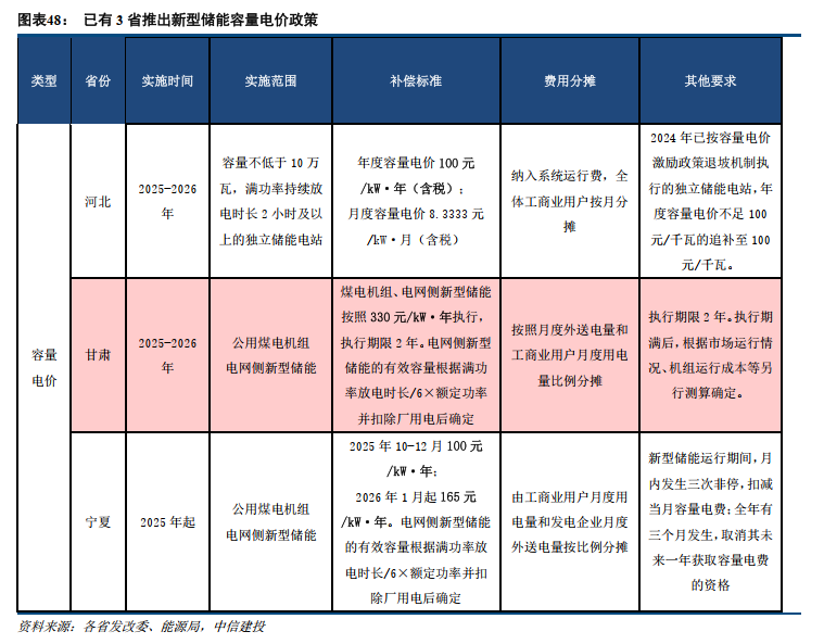 多省试行容量电价。早在2024年1月,河北发改委发布《关于制定独立储能发展先行先试电价政策有关事项的通知》,该文首次提出建立独立储能容量电价机制,以先到先得的竞争方式确定享受容量电价政策的项目名额,容量电费纳入系统运行费用分摊。当时提出的容量电价标准为,2024年5月31日前并网的项目可获得100元/kW/年的容量电价,此后并网的则逐月退坡。2025年3月河北发改委《关于完善独立储能先行先试电价政策有关事项的通知》又将这一容量电价标准再次确定为100元/kW/年,并明确2024年已按容量电价激励政策退坡机制执行的独立储能电站,年度容量电价不足100元/千瓦的追补至100元/千瓦。