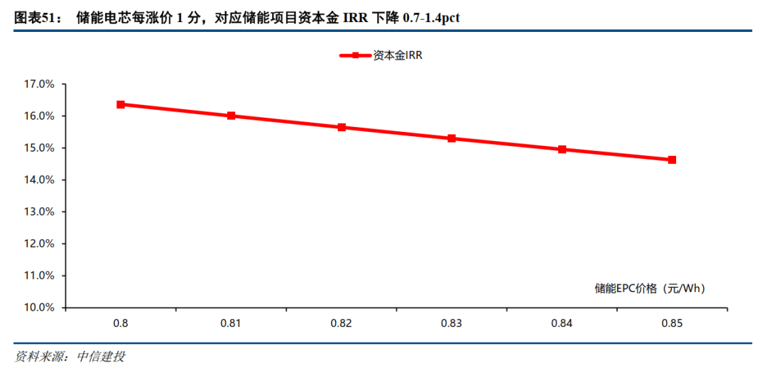 而近期储能由于需求快速爆发,上游供应链部分环节出现涨价。根据我们的测算,储能电芯价格每上涨0.01元/Wh,对应储能项目资本金IRR将下降约0.6pct左右。因此电芯涨价对储能需求预计不会造成实质影响。