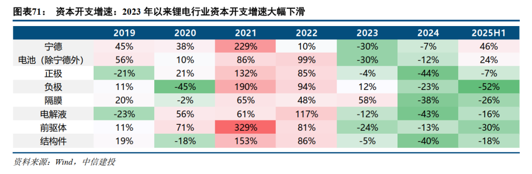 供给端,绝对值来看,2023年开始锂电供给端产能扩张(资本开支)仍保持较高水平,多数为2022年或2023年初开工的项目;但增速来看,2023年下半年开始各环节企业建设新项目新产能的动作明显放缓,全年资本开支同比下降,2024年同比降幅进一步扩大,多数已经恢复到21年之前的水平。