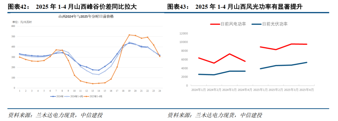 与之对应,2025年1-4月风光出力功率相比于去年有显著提高,风电出力平均增长48%,光伏出力平均增长59%。山西省风电装机容量相比于去年四月增长4%,光伏装机容量增长41%。由此可见,①2025年风光资源明显好于去年同期,大风天较往年增多,降水天相对较少;②新能源装机相比去年同期有明显的增长,综合导致山西省2025年1-4月峰谷价差出现明显提升。