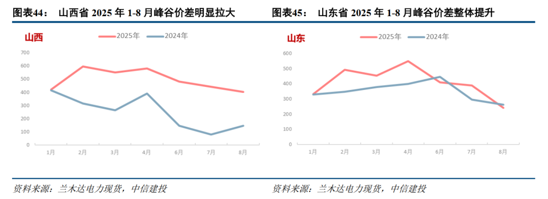 根据各省分时电价数据,我们统计了不同省份1-8月份各月分时平均峰谷价差情况,结果表明,2025年以来山西、山东峰谷价差呈放大趋势,尤其山西地区峰谷价差显著提升。