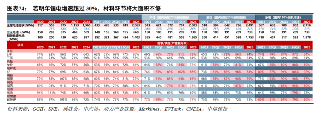 从供需关系看,若明年锂电增速超过30%,材料环节将大面积不够:储能电池若维持中性预期,铁锂正极、6F、隔膜、铜箔都有可能涨价;若乐观预期下,材料环节有望全面涨价,碳酸锂也将迎来价格反转。