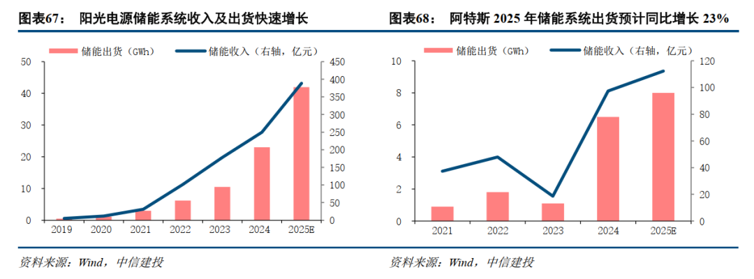 国内头部储能厂商出货持续放量,全球竞争力凸显。以阳光电源为例,其储能系统出货与业务收入近年均实现指数级增长,龙头地位稳固。阿特斯同样增长迅速,凭借其深厚的项目储备与渠道优势,储能系统出货规模持续扩大,共同验证了国内企业在全球储能市场中的强劲增长势头。