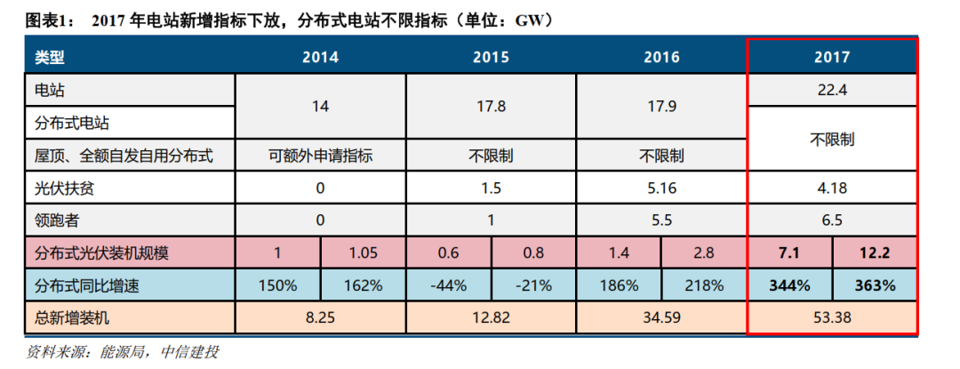 2017年7月,国家能源局发布《关于可再生能源发展 “十三五” 规划实施的指导意见》,一次性下发2017-2020年合计86.5GW新增建设指标。而对采用“自发自用、余电上网”模式的分布式项目全面放开规模限制,突破往年指标束缚。该变化释放了工商业及户用市场的巨大潜力,是驱动全年总装机量远超预期的主因之一。