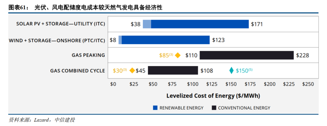 光伏、风电配储较天然气发电具备经济性。根据Lazard的研究,可再生能源+储能供电相比传统能源已具备经济性,光伏+储能、风电+储能,在配储时长为4小时时,相较天然气联合循环发电和调峰天然气发电具备经济性。在包含额外的补贴(如IRA法案中的“能源社区”税收抵免补贴)时,光伏配储、风电配储的度电成本分别可低达38美元/MWh、8美元/MWh。