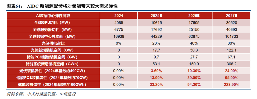 我们预计,2025年、2026年、2027年,AI数据中心新增总功耗分别将达到44.2GW、62.9GW、101.7GW。根据上述测算,则2026年因AI数据中心产业链带来的光伏装机、储能PCS装机、储能装机弹性(相对2024年装机)分别约为10.3%、39.5%、94.3%;至2027年则分别约为24.9%、95.9%、228.9%。