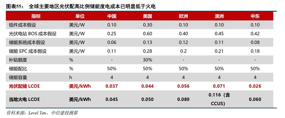 2023年以来,在光伏组件价格及储能系统成本大幅降低后,光伏配储的供电模式经济性大幅改善。根据我们测算,目前全球绝大部分地区,在光伏配50%+4小时储能的模式下,光伏配储度电成本已明显低于火电。
