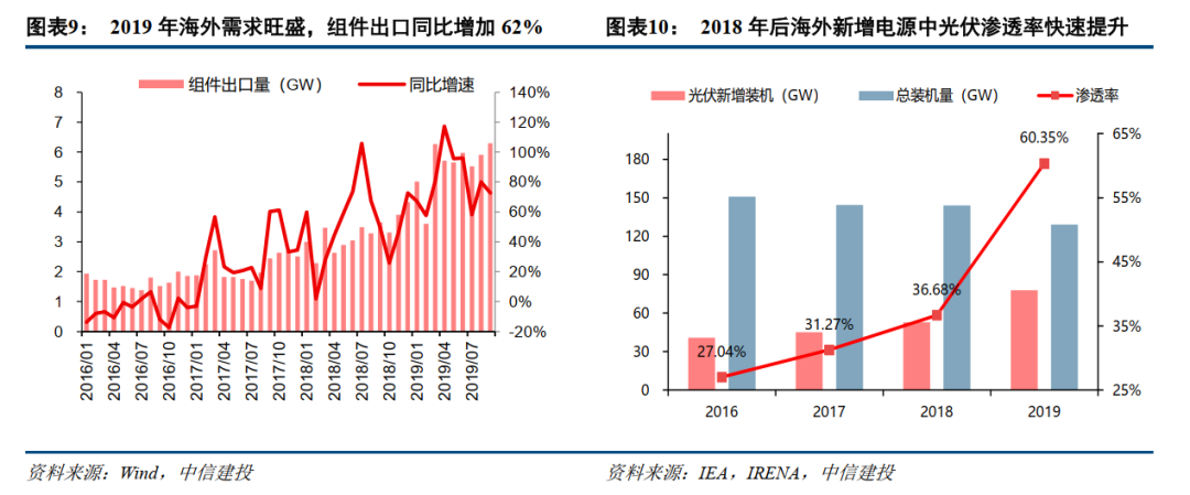 经济性驱动海外市场光伏需求率先爆发,出口数据验证行业高景气。平价经济性与广阔的海外市场空间结合,共同催化了2019年海外需求的爆发,当年中国以外的光伏市场新增装机规模激增至约85GW。强劲的外部需求拉动国内产业链出口表现优异,全年组件出口量高达66.3GW,同比增速达62%。