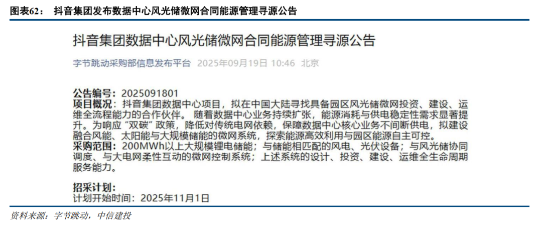 过去两年,采用新能源配储的方式对AIDC进行备电的案例层出不穷。2025年9月,字节跳动采购部发布《抖音集团数据中心风光储微网合同能源管理寻源公告》,宣布在中国大陆寻找合作伙伴,共同建设融合风能、太阳能与大规模储能的微网系统。这一项目包括200MWh以上大规模锂电储能、与储能相匹配的风电、光伏设备以及微网控制系统。
