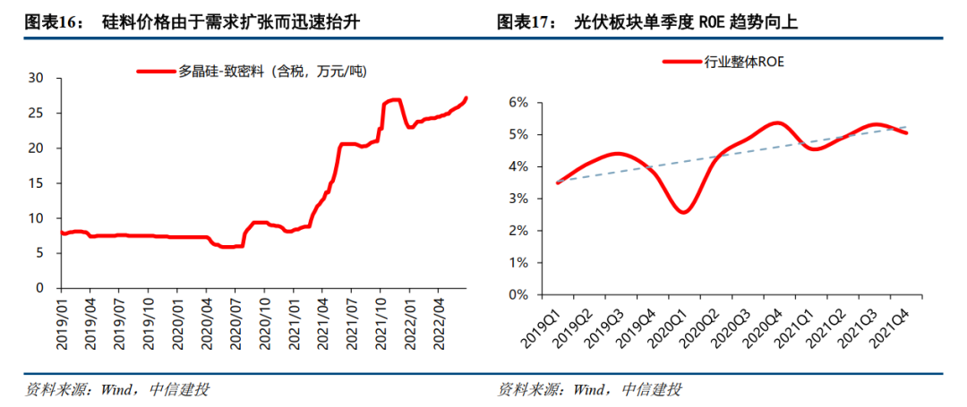 终端需求的超预期爆发,迅速向上传导并带动行业整体ROE回升。其中,扩产周期最长的硅料环节供给弹性最低,成为主要瓶颈。自2020年下半年起,硅料价格率先进入快速上行通道,是行业高景气度的清晰印证。同时高景气度与价格上涨直接驱动了行业整体盈利能力的修复与提升,全行业净资产收益率ROE自2020年低点后呈现清晰的震荡上行趋势,验证了行业景气度的持续改善。