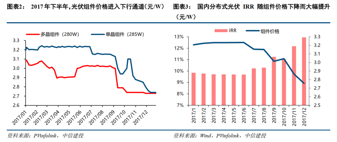 17年630抢装后组件价格大幅下跌,含补贴下分布式经济性大幅改善。“630”抢装结束后,产业链价格进入下行通道,至12月末多晶及单晶组件价格分别自高点下降9.8%与15.3%。而系统初始投资成本的显著降低,直接提升了光伏电站,特别是分布式项目的IRR。根据测算,在计入2017年初执行的分布式电价补贴后,下半年组件价格下行使得分布式光伏项目内部收益率从约10%持续提升至年末近13%的水平,需求实现快速增长。