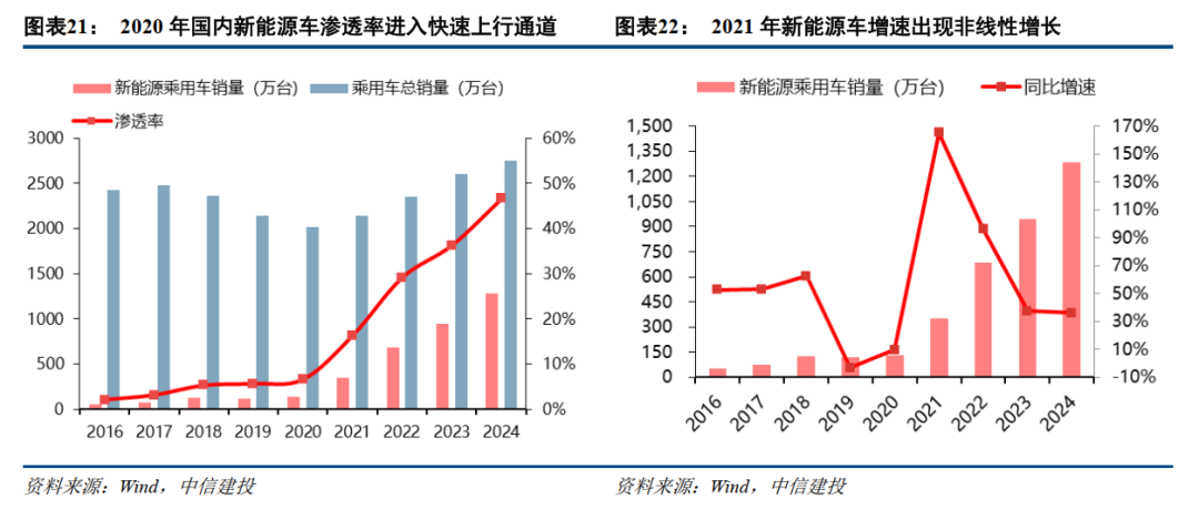 2、新能源汽车则是在补贴退坡的压力下,产品成本经过2年时间的下降后已具备性价比。同时2020年开始,新款车型百花齐放,2021年车型结构进一步优化,带动新能源车渗透率快速提升至20%以上,并在4年内实现了渗透率20%-60%的跃升,行业迎来一轮渗透率的加速提升。
