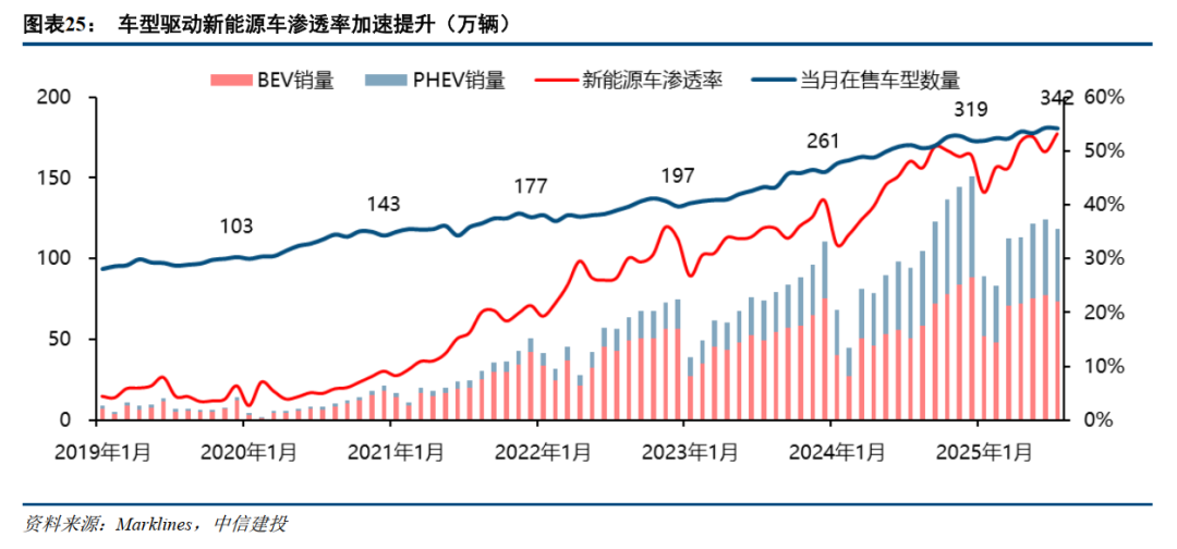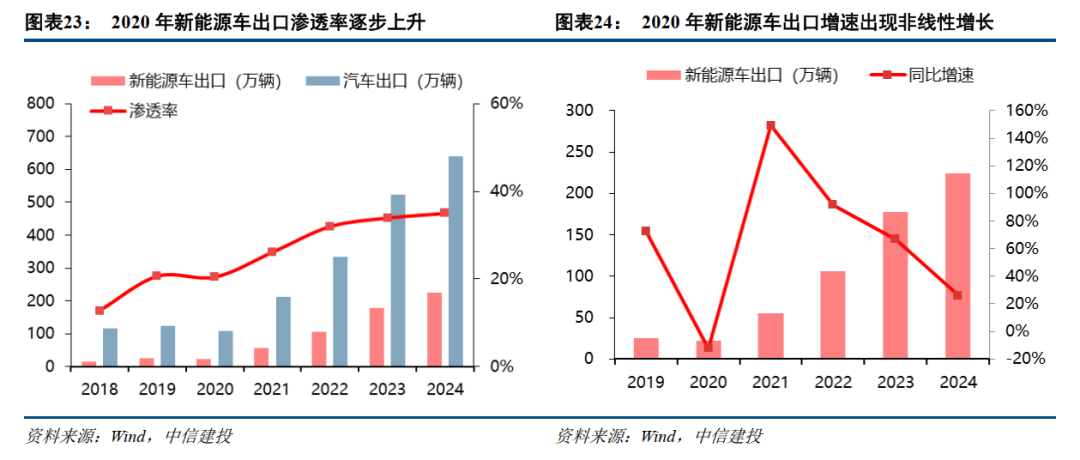 经济性拐点叠加新车型百花齐放,新能源车渗透率呈现非线性加速提升。2020年之前,国内新能源车市场渗透率长期在低位徘徊。经济性与产品力问题解决后,需求迅速释放,渗透率进入陡峭的拉升通道,至2021年末已突破20%。这一趋势在后续得以延续并加强,至2025年,单月销售渗透率已达50%以上,验证了经济性拐点后渗透率的加速提升。出口方面,自2020年起,新能源车在汽车总出口中的占比开始进入快速上行通道。