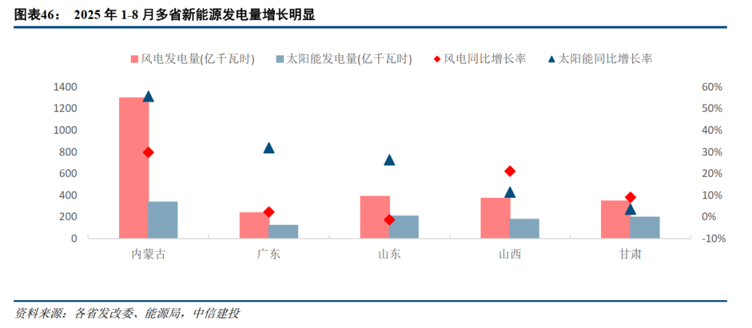 从新能源发电结构角度来看,1)山西省:2025年1-6月,新能源(风电+光伏)装机容量达7167万千瓦,占比超46%。光伏发电量同比高增40.33%,成为增长最快电源。2)山东省:2025年1-6月,风电、光伏发电合计装机容量高达约1.186亿千瓦,同比增长32.44%,占总发电装机容量的47.74%,比重较2024年同期大幅提升6.18个百分点,较2024年底提升3.48个百分点。
