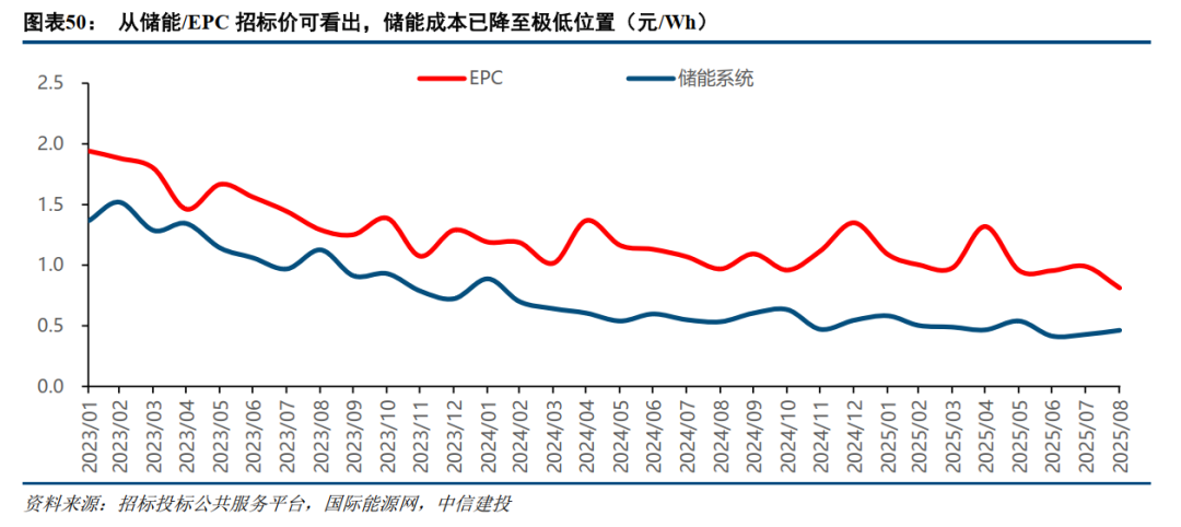 储能投资成本已降至极低水平。产业链技术进步与规模效应带动储能系统及EPC中标均价持续下降,截至2025年8月储能系统/EPC中标均价已降至0.5和0.8元/Wh附近。