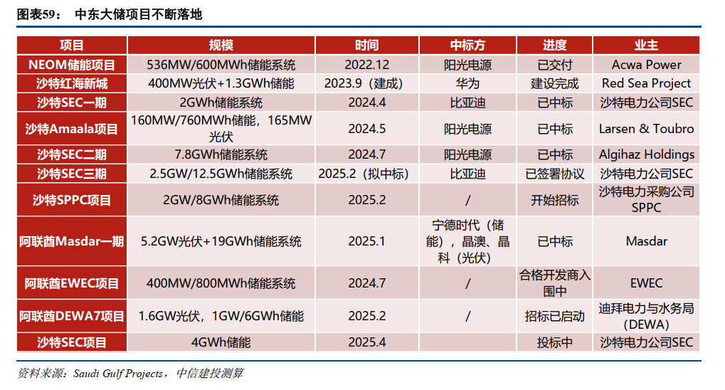 中东市场:光伏配储成本大幅降低后已成为重要供电形式之一。2024年,中东多个GWh级别大储项目落地,上半年SEC一期、二期分别已授予比亚迪、阳光电源,三期12.5GWh项目授予比亚迪、Masdar 19GWh项目授予宁德时代。并且部分项目主要搭配光伏、风电等新能源,采用新能源配储的模式为AIDC供电。后续中东项目预计仍将超预期释放,Masdar二期、三期项目有望持续招标20GWh级别项目,SPPC、SEC后续若干期10GWh项目亦有望逐步释放。