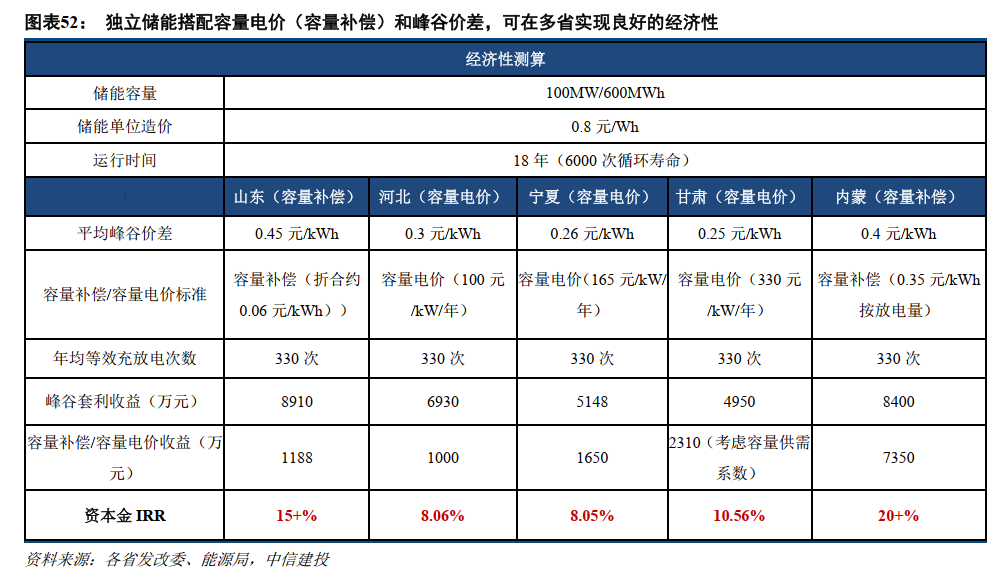 独立储能搭配容量电价(或容量补偿)和峰谷价差套利,已可实现较好的经济性,我们对几个典型省份进行测算,得到如下结果: