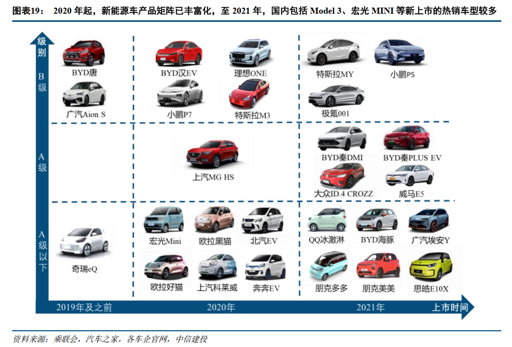 2020年成为产品供给的爆发元年,全年新上市车型达55款,包括特斯拉Model 3、五菱宏光MINI等爆款,直接带动下半年销量同比增长65%。2021年供给端则转向结构优化,以比亚迪秦DMI为代表的新车型有效填补了A级主流市场空白,带动该级别车型销量占比回升。产品矩阵的丰富与多元化,为后续市场全面打开奠定了坚实基础。