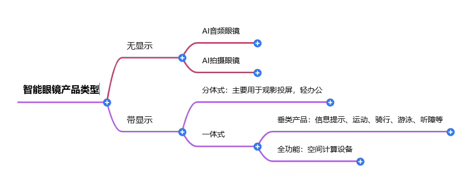 在产品迭代方面,笔者总结了以下一张图,眼镜可以大致划分为两大类共五种形态,相较于前些年的“野蛮生长”,现如今的眼镜产品发展路线已经变得相对清晰,行业逐渐渡过了它的“迷茫期”。