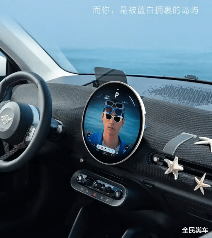 内饰延续 MINI 的复古科技风,中控台采用 “海盐白” 与黑色双拼配色,与车身颜色形成呼应。标志性的圆形中控屏升级为 10.25 英寸触控屏,内置专属海洋主题 UI 界面,启动时会浮现海浪动画。方向盘采用 Nappa 真皮包裹,底部辐条加入蓝色缝线,多功能按键区域印有波浪纹路。座椅采用环保织物与皮革拼接材质,椅面印有微型海浪图案,靠背处绣有蓝色 “MINI” 字母标识。