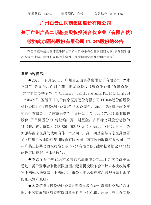 9月28日,广药集团旗下上市公司广州白云山医药集团股份有限公司(以下简称“白云山”)与南京医药股份有限公司(以下简称“南京医药”)同时发布公告,白云山旗下广州广药二期基金股权投资合伙企业(有限合伙)(以下简称“广药二期基金”)拟出资748,807,492.58元人民币收购Alliance Healthcare Asia Pacific Limited(“AHAPL”)持有的南京医药股份144,557,431股非限售股份,占南京医药总股份数的11.04%。收购完成后,广药二期基金拟将成为南京医药第二大股东。